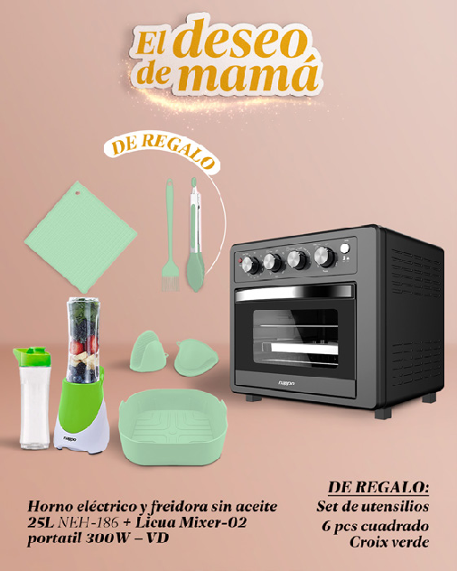 HORNO ELECTRICO Y FREIDORA S/ACEITE 25L NEH-186+LICUA MIXER-02+SET DE